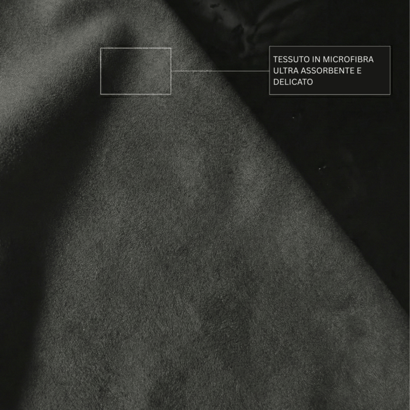 - Microfibra ad alta assorbenza per asciugare rapidamente viso e corpo.